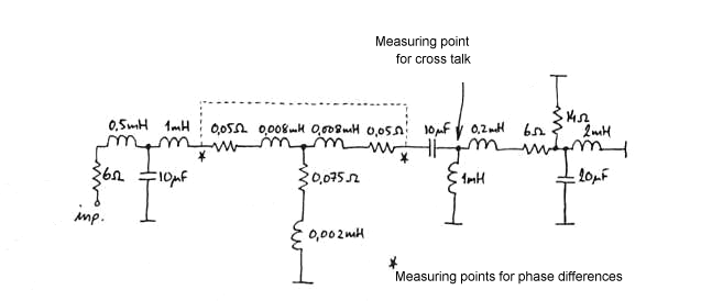 Picture 3: The diagram for the simulation. The two components at the far left simulate the woofer resistance and inductance. The two next is the lowpass filter for the woofer. Of the next six components, the horizontal represents the two cables and the vertical represents the output impedance of the amplifier. The broken line converts from bi-wire to single wire. Therefrom come two components representing the high pass filter to the tweeter and five components representing the tweeter.