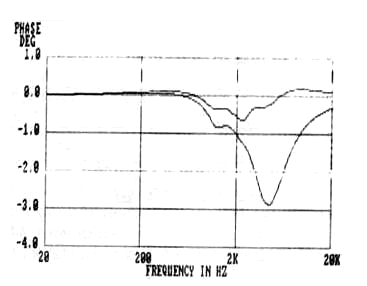 Picture 4: This simulation is based on the diagram of picture 3. Here you can see that a phase difference has arisen when biwiring is used. The reason why the phase difference is largest just above the cross over frequency is that the inductance of the cable resonates with the capacitance of the high pass filter when not the inductance of the low pass filter is available in this range as when single wire is used. The most probable reason to the capricious sound of biwiring is that on top of this steady state error another, transient induced phase error between the cables will appear when playing music. This changes the radiation pattern of the speaker with the music. The human ear is very sensitive to such phenomena.